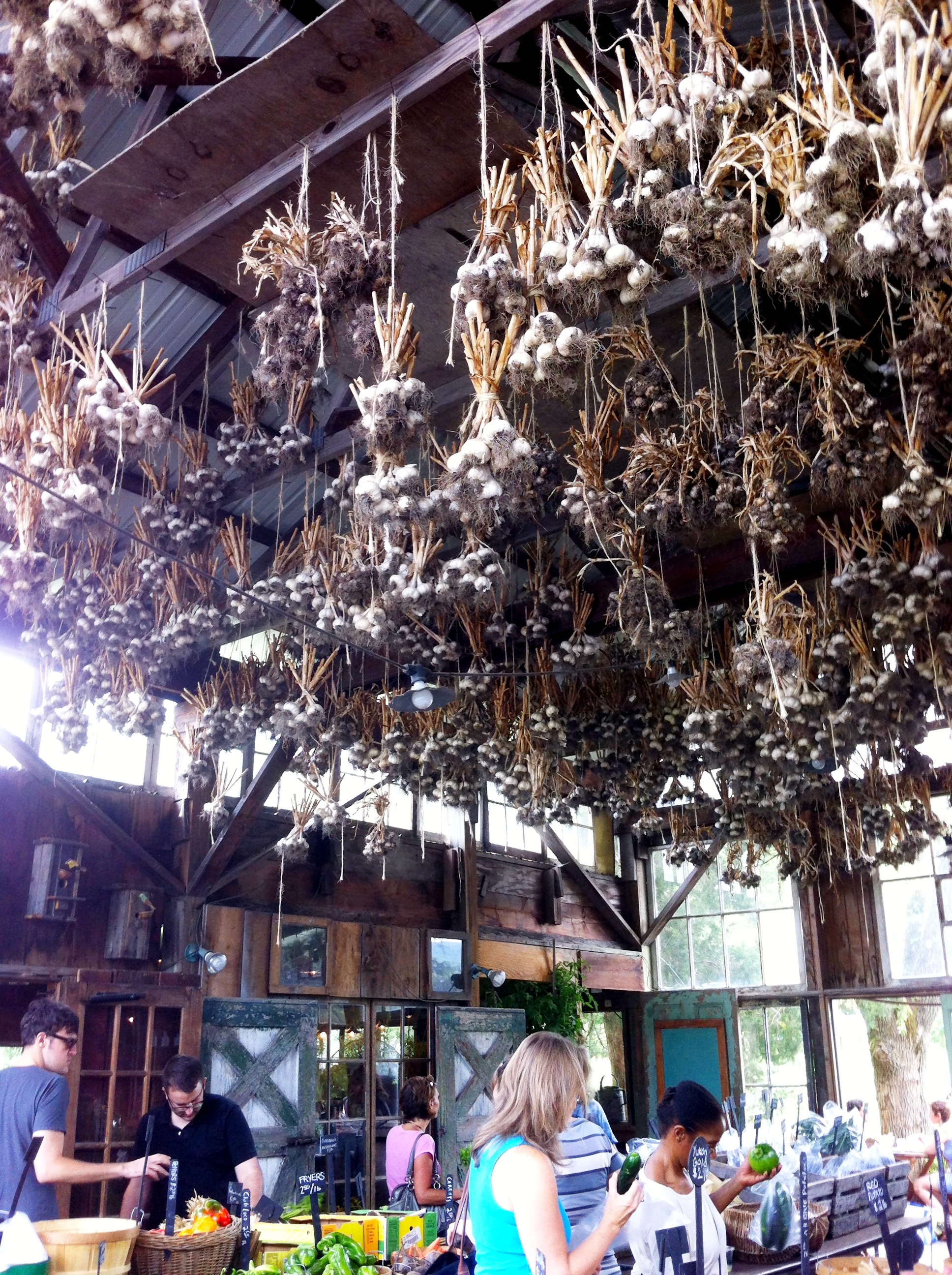 Lining the tables are fresh, ripe and almost ridiculously gorgeous examples of the farm’s produce. An entire table is devoted to fresh herbs—a lush forest that borders crates of deep purple plums and yellow peaches. Bunches of garlic hang from the ceiling, and the gigantic faces of sunflowers cheerfully smile at you while you pick out the perfect kale and heirloom tomatoes.