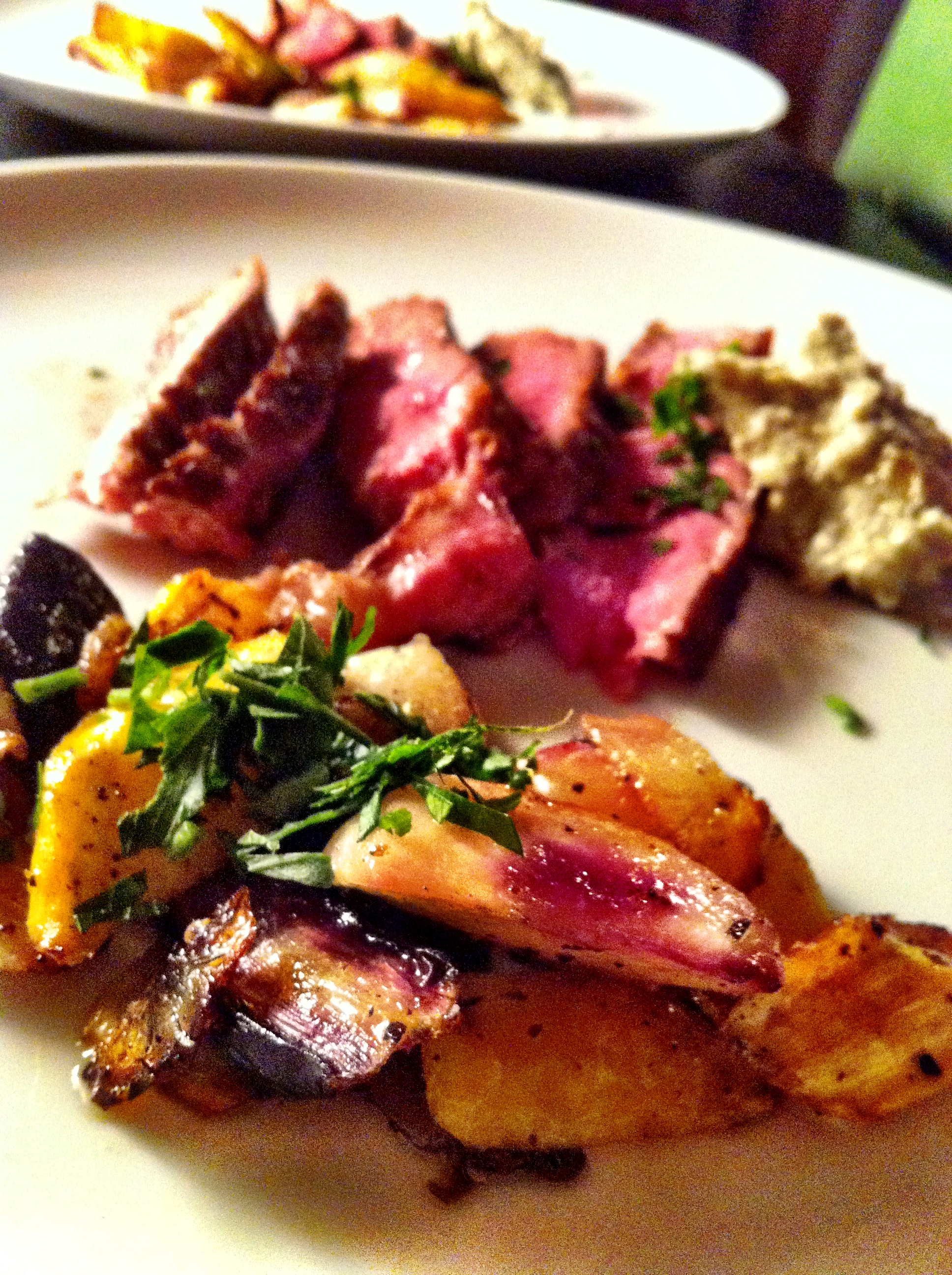 After procuring a few bottles of wine and gin to accompany the meal, we returned to Dane’s apartment. With the ribeye (quickly seared on both sides, just enough to leave a deep pink center) as our main, we decided to roast sweet purple, orange and white carrots with herbs in a cast-iron pan, throw together a reduced kale salad with pecorino, and slice the fat, colorful heirlooms tomatoes to serve with purple basil and a bit of sea salt. After Nolan and I were caught munching on a particular blue cheese we found in the fridge, Dane quickly commandeered it to create a blue cheese butter to accompany the ribeye.