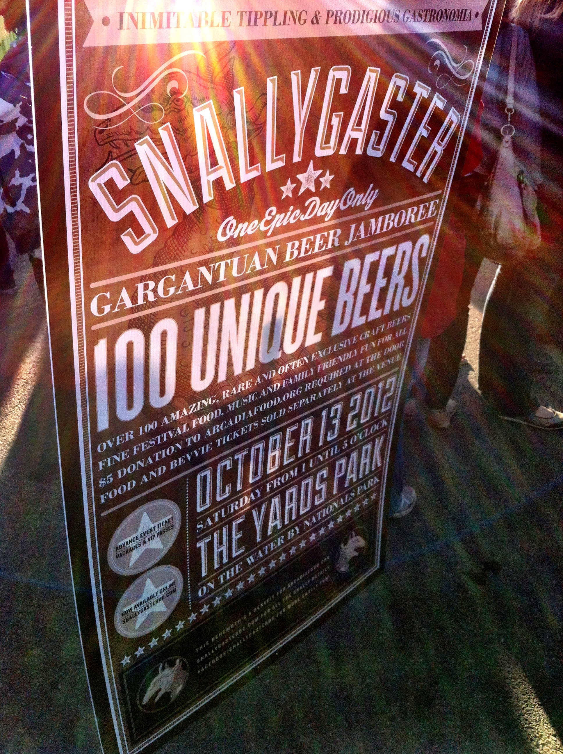 Following on the heels of my visit to the Applebutter Festival, this past Saturday involved a trip to a different kind of festival. A Beer Festival… And despite the existence of the “Little Monster Zone,” this event was far more adult-themed. For those of you who don’t belong to the beer nerd camp, Snallygaster was organized by Neighborhood Restaurant Group, a band of restaurateurs and beer enthusiasts that are responsible for Churchkey (my favorite bar in DC), Rustico, Birch and Barley, Red Apron Butcher, and their latest venture, a DC brewery by the name of Bluejacket. For the inaugural Snallygaster event, Beer Director Greg Engert hand-picked almost 150 of his favorite beers and ciders, including a selection of over 20 different Pumpkin ales to celebrate fall. The entire thing was a benefit for Arcadia Farms, which had an awesome school bus on site with fresh produce you could pick up (and pair with your beer?….)