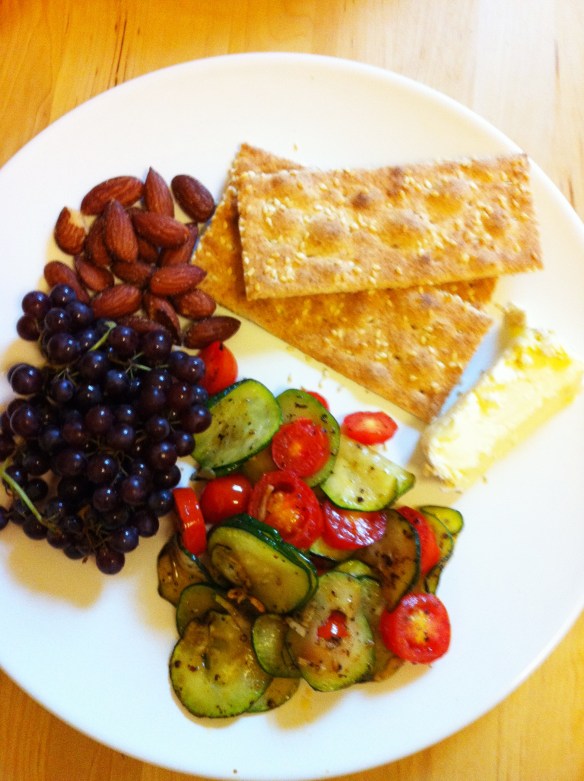 Picnic Dinner One: Ak-mak crackers, brie, champagne grapes, roasted almonds, and a quick blistering of thinly-sliced zucchini, tomatoes and garlic.