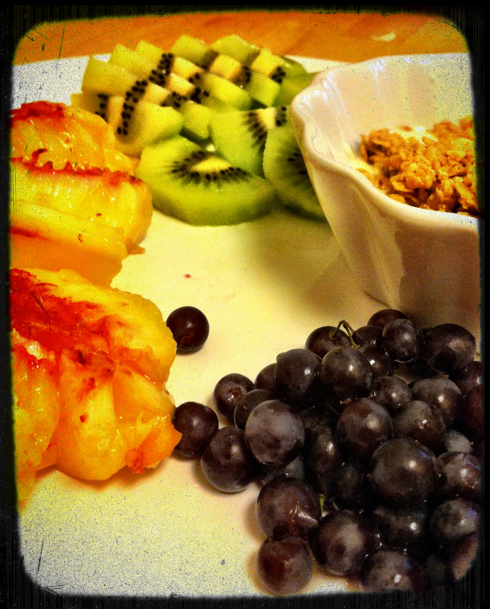 Picnic Dinner Two: More champagne grapes, a white peach, kiwi, and yogurt with a bit of granola. Who says you can’t have yogurt and fruit for dinner?
